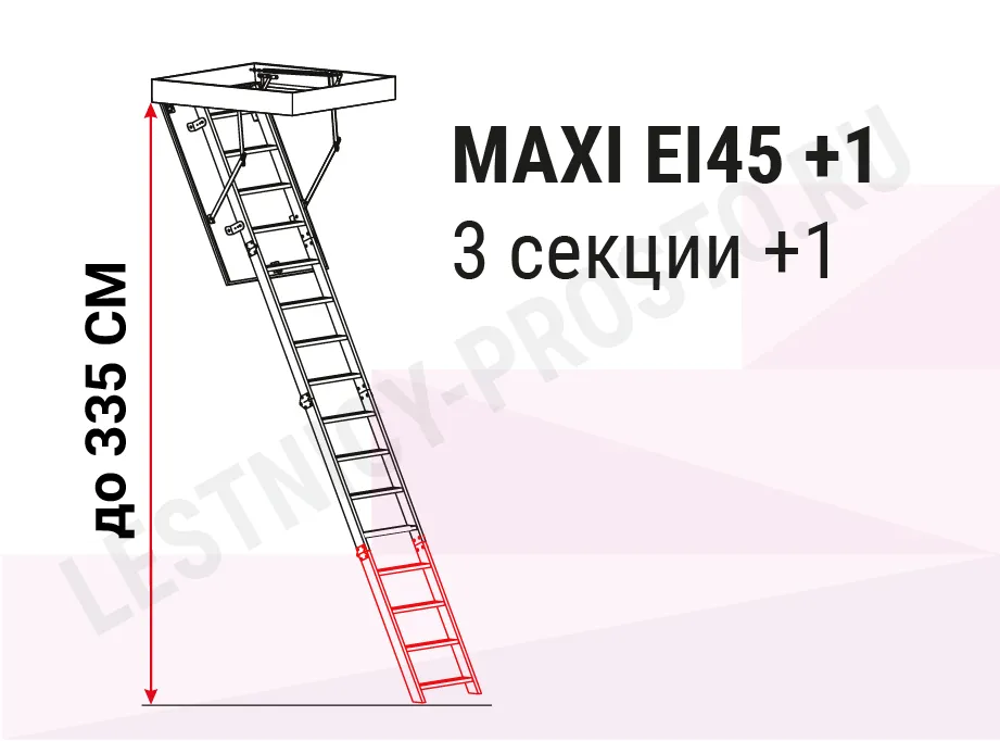Данный вариант представляет из себя комплект из лестницы MAXI EI45 и дополнительной секции, увеличивающей базовую высоту до 3350 мм. Крышка лестницы MAXI EI45 отличается двойным уплотнением, состоящим из одинарного противопожарного уплотнения и крышки утепленной пенопластом.