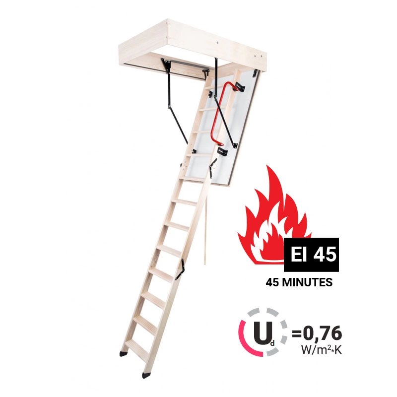 Чердачная лестница MAXI EI 45 имеет класс огнестойкости EI45, что означает 45-минутный предел сопротивляемости пожару.