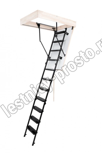 Лестница складная трехсекционная. Рабочая поверхность полностью выполнена из металла и покрашена порошковой краской. Термоизоляционная крышка типа "сэндвич", толщиной 30 мм, утеплена пенопластом, облицована с двух сторон ДCП белого цвета.