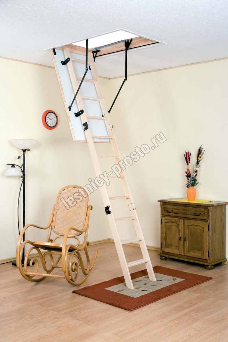 Лестница складная трёхсекционная, изготовлена из сосны. Термоизоляционная крышка типа "сэндвич" утеплена пенопластом, облицована с двух сторон ДСП белого цвета. Короб люка с однослойным уплотнителем. Все металлические элементы лестницы покрыты порошковой краской, ступени лестницы имеют антискользящие насечки и закреплены в столярное соединение «ласточкин хвост», что позволяет выдерживать нагрузку до 150 кг. Деревянный стержень для открывания лестницы в комплекте.