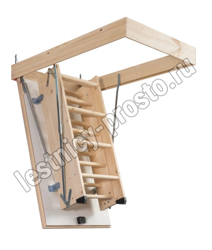 В изготовлении лестницы используется дерево хвойных пород. Лестница оснащена утепленным двусторонним белым люком, который практически не заметен на потолке. В случае необходимости крышку люка можно перекрасить в любой другой, подходящий для интерьера цвет.