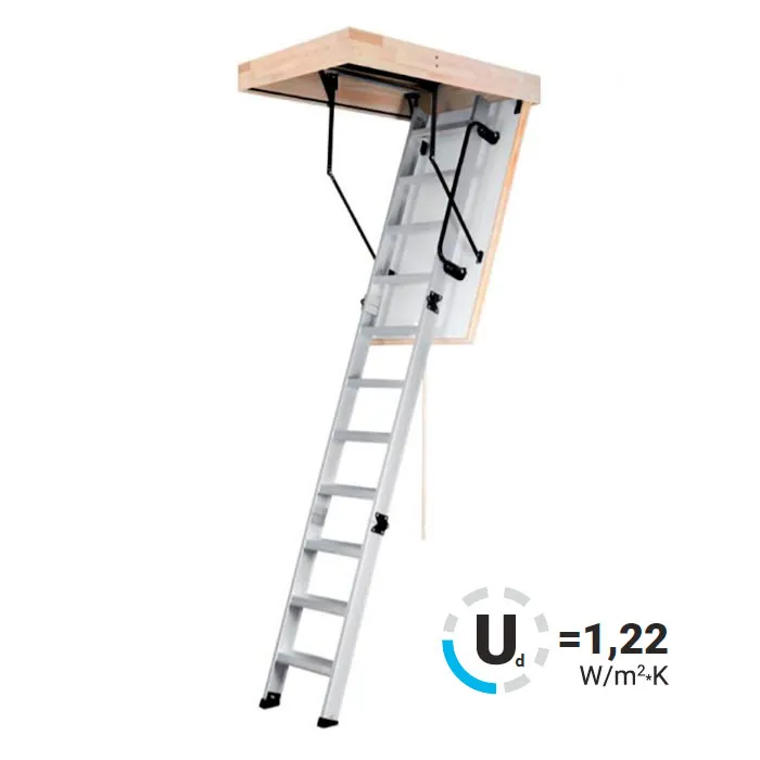 Складная 3-х секционная чердачная лестница. Рабочая поверхность полностью выполнена из алюминия. Термоизоляционная крышка типа "сэндвич" имеет усиленную теплозащиту, облицована с двух сторон ДВП белого цвета. По контуру короба имеется уплотнитель; Все металлические элементы лестницы покрыты порошковой краской.