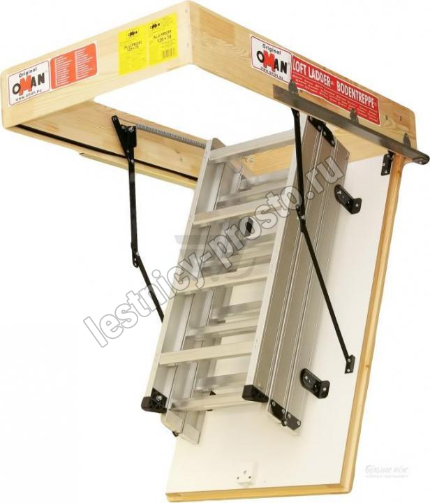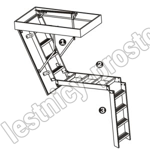 Складная 4-х секционная чердачная лестница. Рабочая поверхность полностью выполнена из алюминия. Термоизоляционная крышка типа "сэндвич" имеет усиленную теплозащиту, облицована с двух сторон ДВП белого цвета. По контуру короба имеется уплотнитель; Все металлические элементы лестницы покрыты порошковой краской.