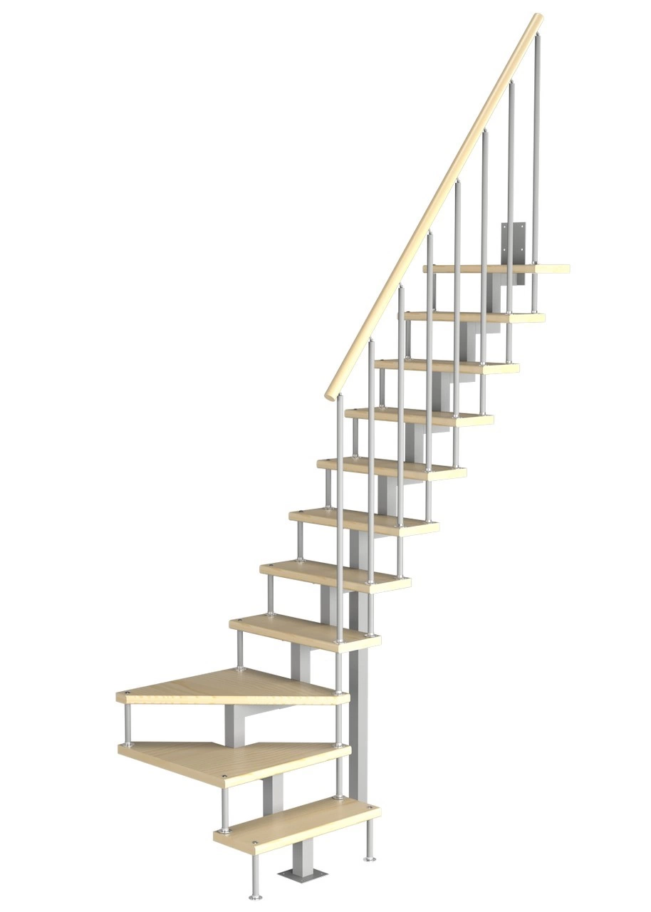 Конструкция лестницы отличается от базовой модели изящными изогнутыми тетивами и поручнем, закругленными забежными (поворотными) ступенями.