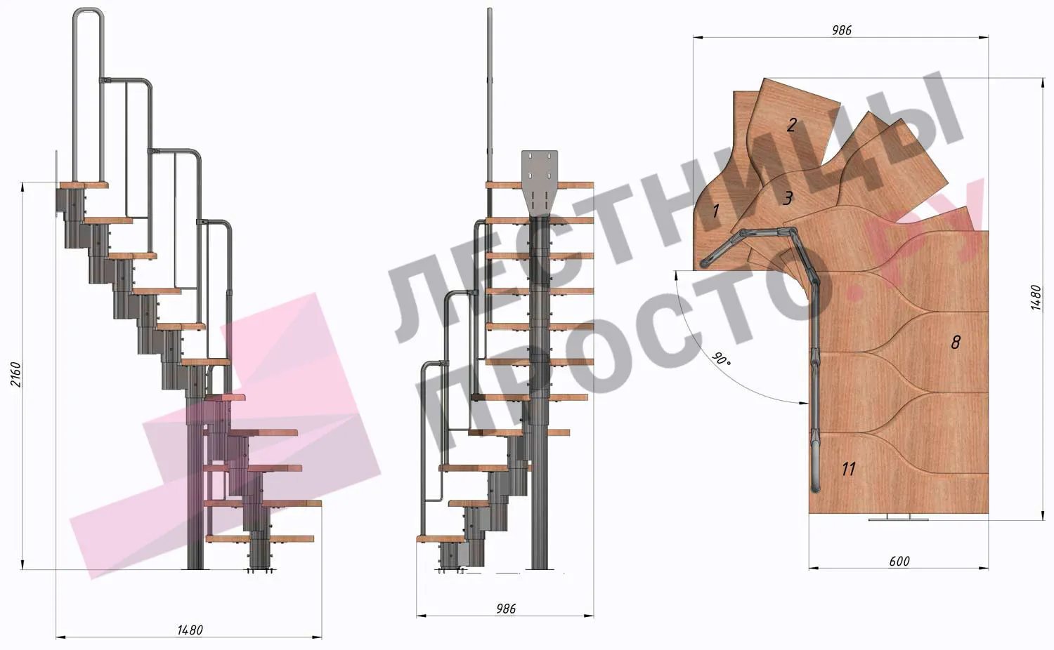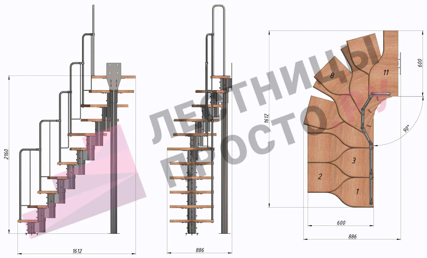 | Лестница Prosto Urban Grey г-образная гусиный шаг 600 мм, h216-312 см (12 ступеней) |