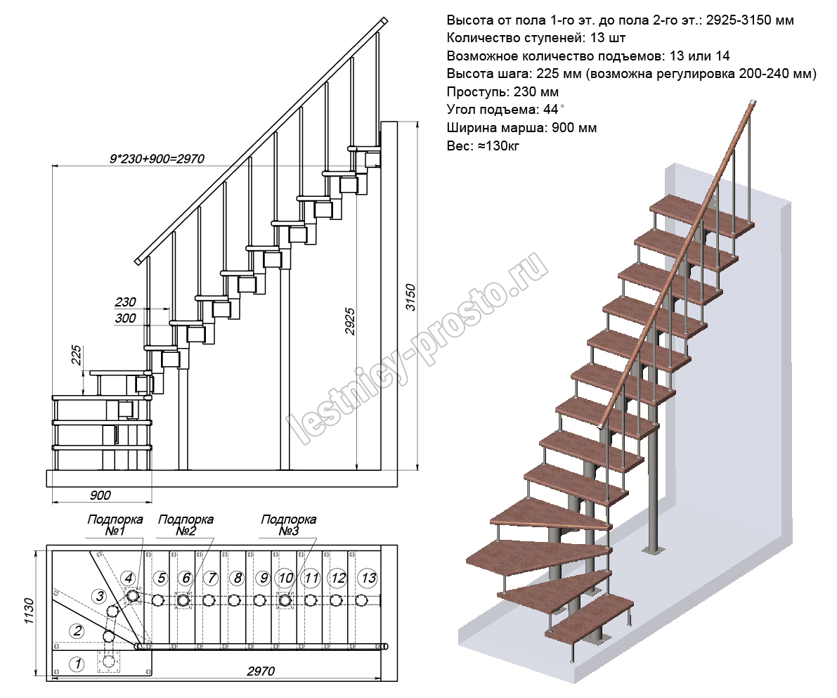 Количество ступеней до поворота - может быть любым , по запросу мы рассчитаем стоимость и сделаем чертеж-схему в соответствии с вашими параметрами.