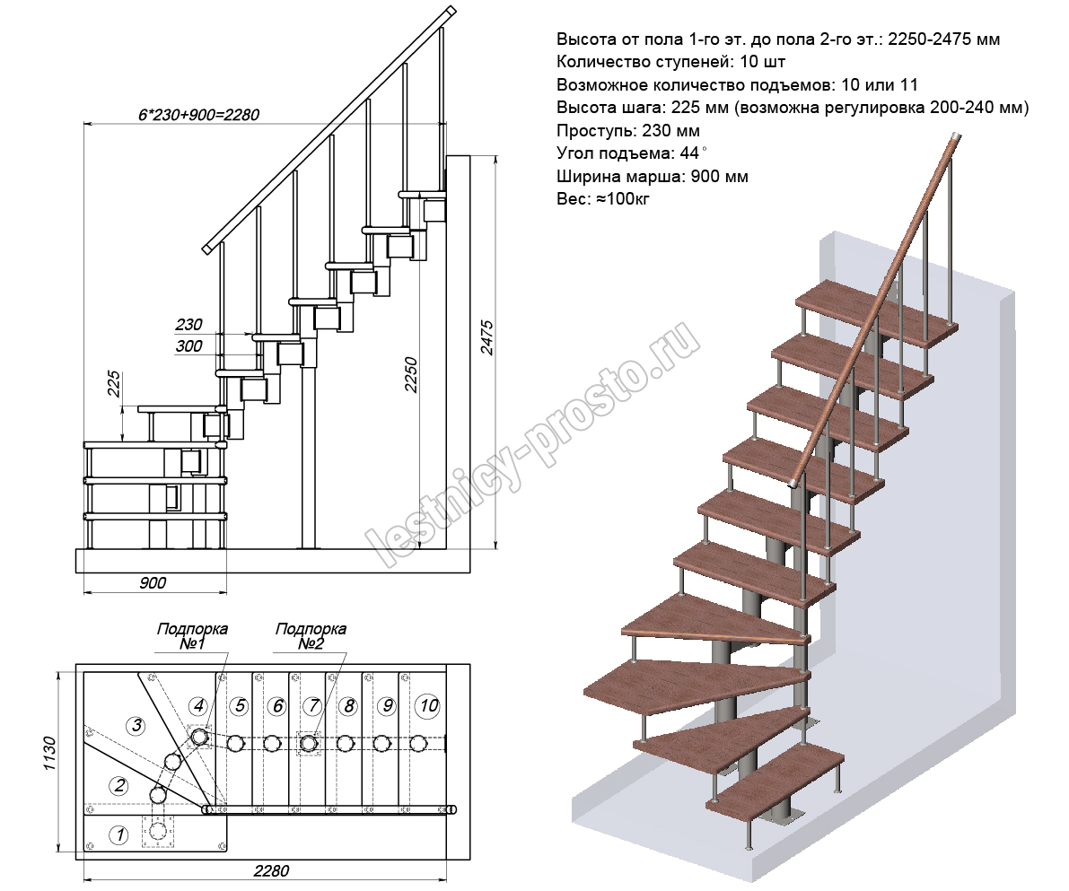 Модульная лестница PROSTO MODULE Г-образная/ h225 см