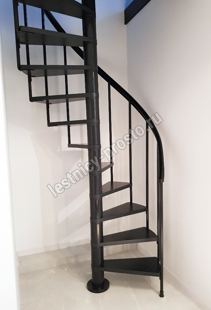Ступени лестницы изготовлены из бука по технологии MULTIPLEX и покрыты износостойким защитным лаком. Лестница монтируется как по часовой стрелке, так и против. Возможен монтаж в круглый или квадратный проём. Ограждение: стальные трубки, Ø25 мм RAL 7016. Поручень: гибкий цельный ПВХ-поручень Ø40 мм антрацитового цвета. Конструкция и балюстрада окрашены порошковым способом в антрацитовый цвет (RAL 7016).