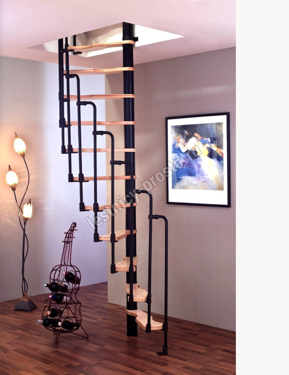 Компактная надёжная лестница. Ступени толщиной 30 мм, изготовлены из массива берёзы по технологии Multiplex, лакированные. Все металлические части оцинкованы, горячим способом и покрыты порошковой краской - черного цвета; Лестница имеет надёжную несущую стальную конструкцию.