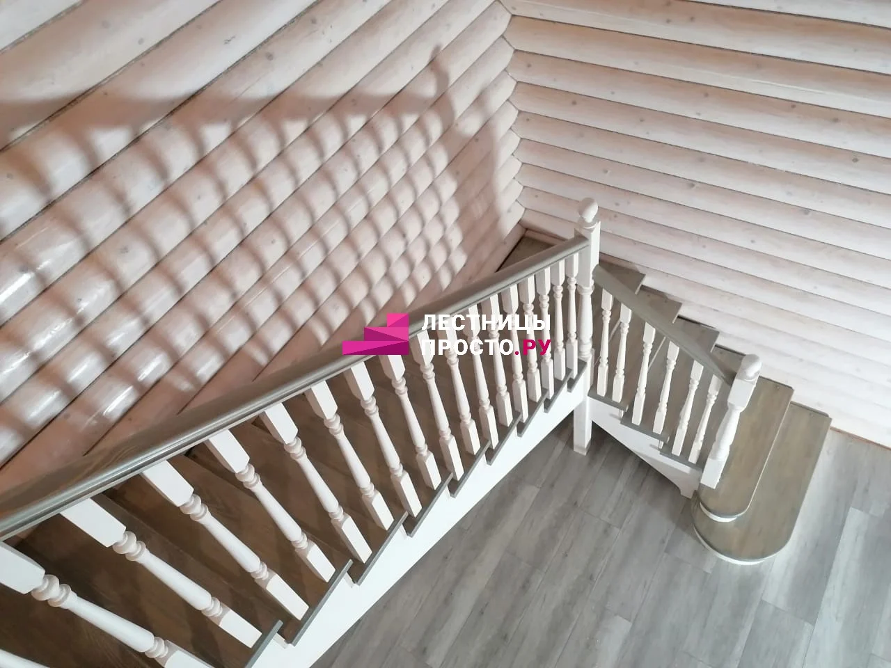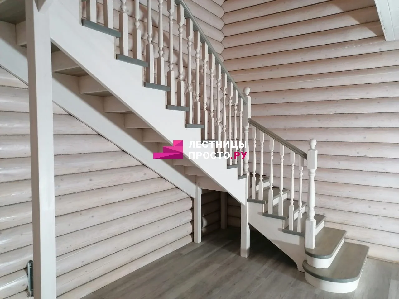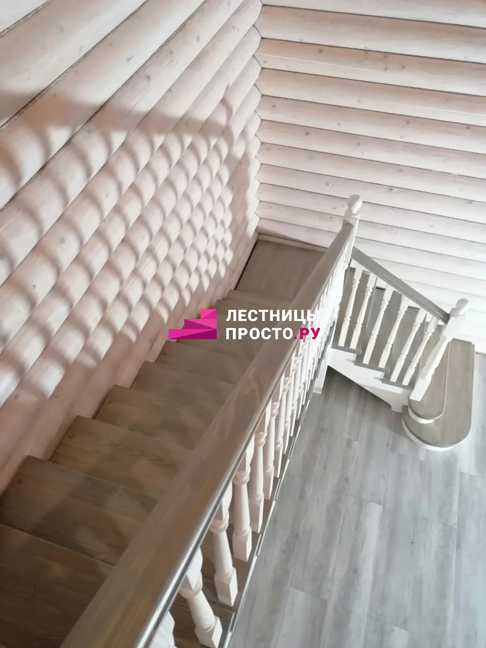 Ступени и поручень выполнены из ясеня паркетной склейки, столбы, косоуры, подступёнки - сосна.