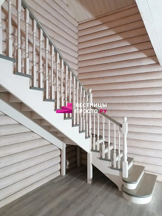 Поворот лестницы реализован через поворотные ступени, конструкция трёхмаршевая на косоуре.